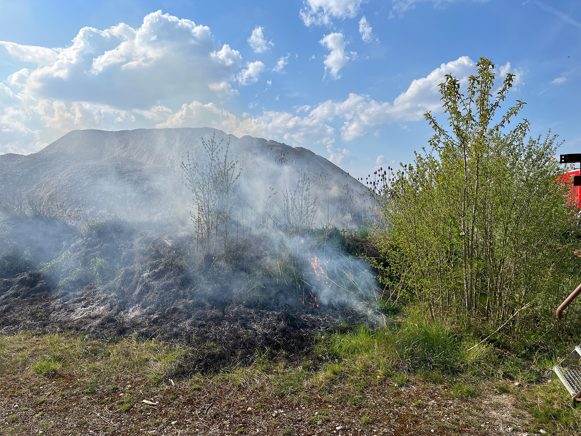 Hinter dem Kieswerk war eine Fläche von ca. 40m² in Brand geraten. Ein Trupp unter Atemschutz löschte den Brand rasch ab, zur Sicherheit kam auch der Dachmonitor zum Einsatz, um den Bereich großflächig mit Wasser zu durchnässen. Nach der Kontrolle mit der Wärmebildkamera konnte die Feuerwehr die Einsatzstelle an die Polizei übergeben.