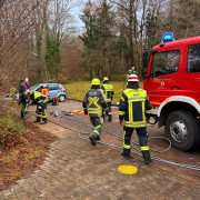 Der Prüfungstag begann mit einem theoretischen Teil, in dem die Feuerwehrfrauen und männer 15 Fragen beantworten mussten. Anschließend folgte die praktische Prüfung, die realitätsnahe Einsatzsituationen einer taktischen Gruppe abbildete. Dazu gehörten die Rettung einer eingeklemmten Person nach einem Verkehrsunfall, die Befreiung einer unter einem Betonteil eingeklemmten Person mithilfe von pneumatischen Hebekissen, ein Löschaufbau mit taktischer Ventilation sowie ein weiterer Löschaufbau mit Personenrettung über die Steckleiter. Jede Teilnehmerin und jeder Teilnehmer mussten eine Station vollständig abarbeiten. Die Prüfungsverantwortung lag bei Johannes Bußjäger, Kreisbrandmeister für die MTA, der gemeinsam mit weiteren Prüfern aus den beteiligten Wehren den Ablauf nach einem Katalog bewertete.