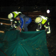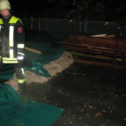 Infolge von Dachsanierungsarbeiten am Flachdach der St. Konrad Schule kam es nach Regenfällen an mehreren Stellen in Klassenzimmern zu Wassereinbruch. Die Feuerwehr beseitigte mit E-Saugern das Wasser in den Räumen und dichtete das Flachdach provisorisch mit einem Sandsackwall und einer großen Plane ab. Zusätzlich wurden noch Ablaufmöglichkeiten geschaffen, um das Wasser vom Dach abzuleiten.