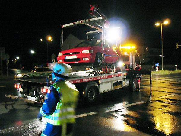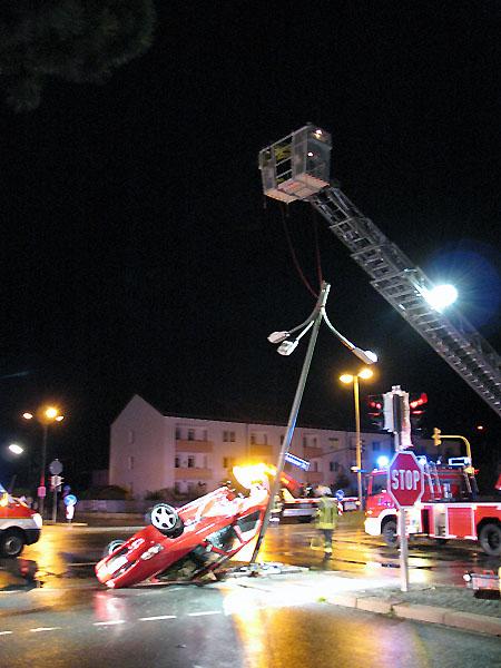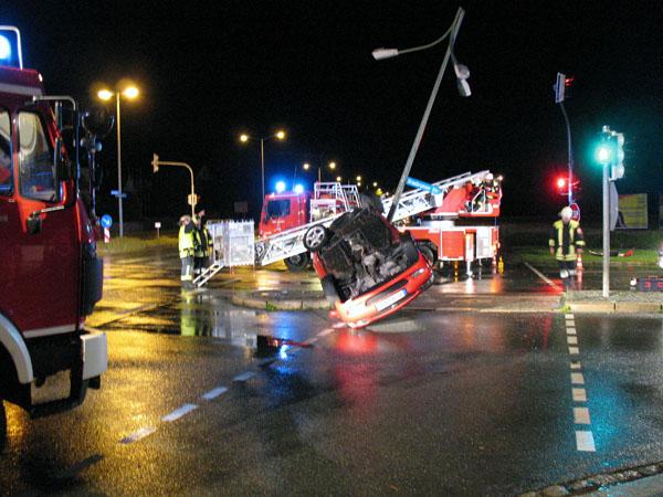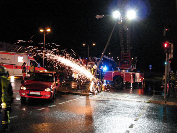Die Feuerwehr übernahm zusammen mit der Polizei die Verkehrsabsicherung, der Rettungsdienst versorgte die Fahrer der beiden Fahrzeuge. Über die Drehleiter wurde die geknickte Laterne gesichert, abgeklemmt und mit einem Trennscheifer abgeschnitten. Die Feuerwehr leuchtete die Unfallstelle aus und nahm auslaufende Betriebsstoffe auf.