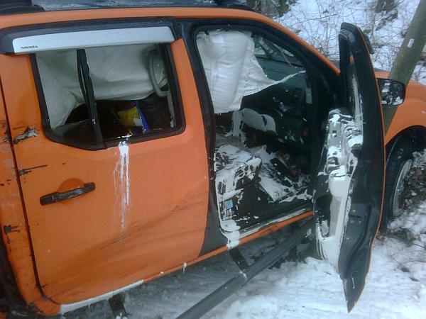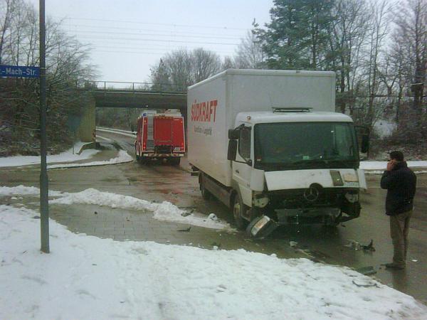 Ein Kleinlastwagen war mit einem Pickup zusammengestoßen und hat diesen auf einen Laternenmasten geschoben. Dabei wurde der Fahrer des Pickups mittelschwer und der Fahrer des Lastwagens leicht verletzt. Bis zum Eintreffen des Rettungsdienstes versorgte die Feuerwehr die beiden Fahrer und sicherte die Unfallstelle ab. Zusätzlich wurden die Stromwerke benachrichtigt, um den Laternenmasten zu sichern.