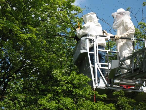 Mit der Drehleiter konnte eine Lehrkraft zusammen mit einem Schüler das Bienenvolk wieder einfangen. Dazu musste der Ast abgesägt werden, an dem sich das Volk gesammelt hatte.