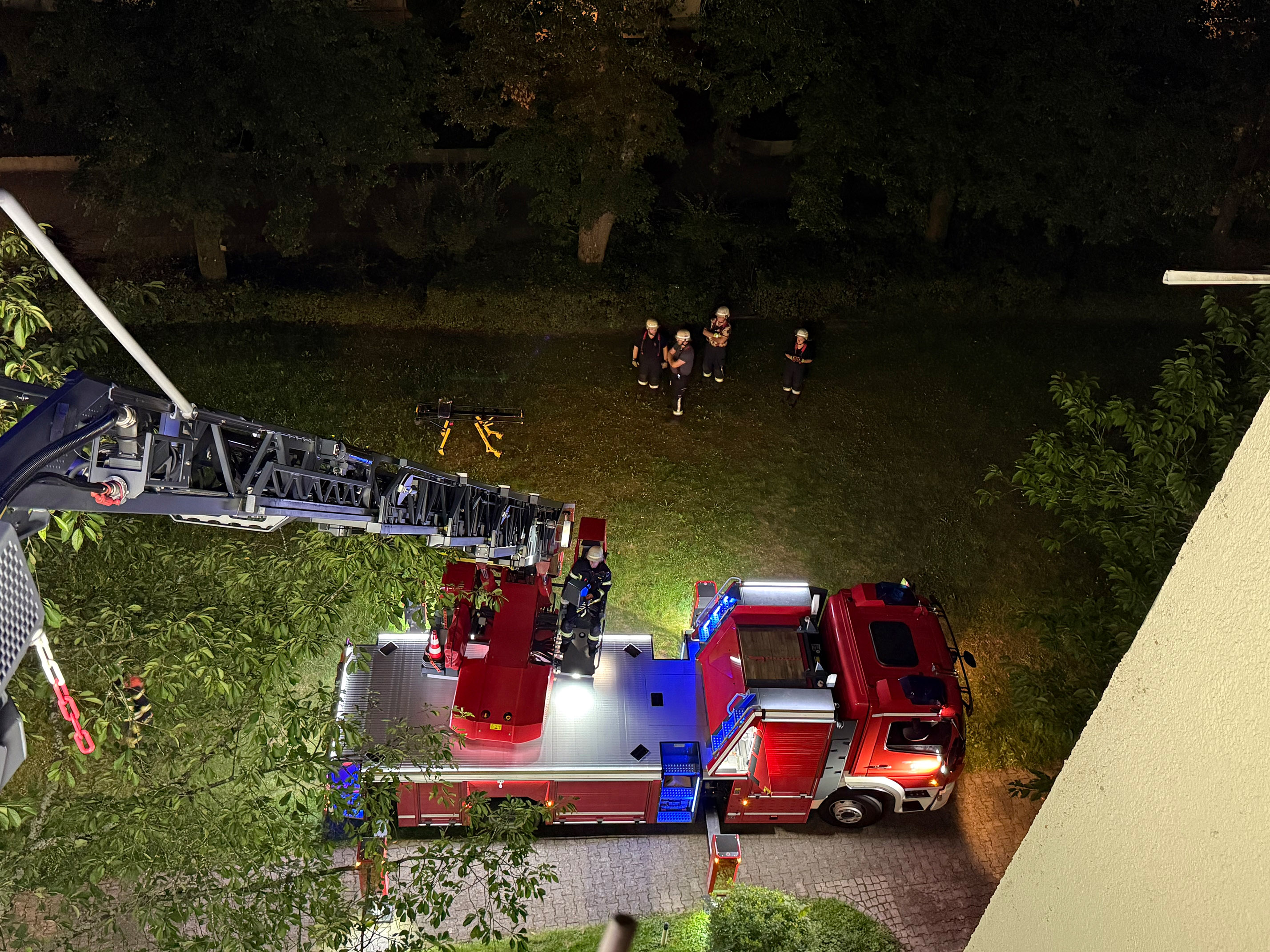 Mit Spezialwerkzeug verschafften sich die Einsatzkräfte der Feuerwehr Haar Zutritt zur Wohnung und fanden dort den Bewohner am Boden liegend vor. Der Rettungsdienst übernahm die Erstversorgung. Da der Patient liegend transportiert werden musste, kam die Drehleiter zum Einsatz. Mit der Krankentragenhalterung am Drehleiterkorb konnte er auf Erdgleiche gebracht werden. Mit einem Rettungswagen wurde der Patient anschließend in eine Münchener Klinik gebracht und die Feuerwehr rückte wieder ab.