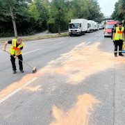 Bei einem Auffahrunfall zwischen zwei PKW waren bei einem Betriebsmittel ausgelaufen. Die Feuerwehr man diese mit Bindemittel auf, die Polizei sicherte dabei die Einsatzstelle gegen den fließenden Verkehr ab.