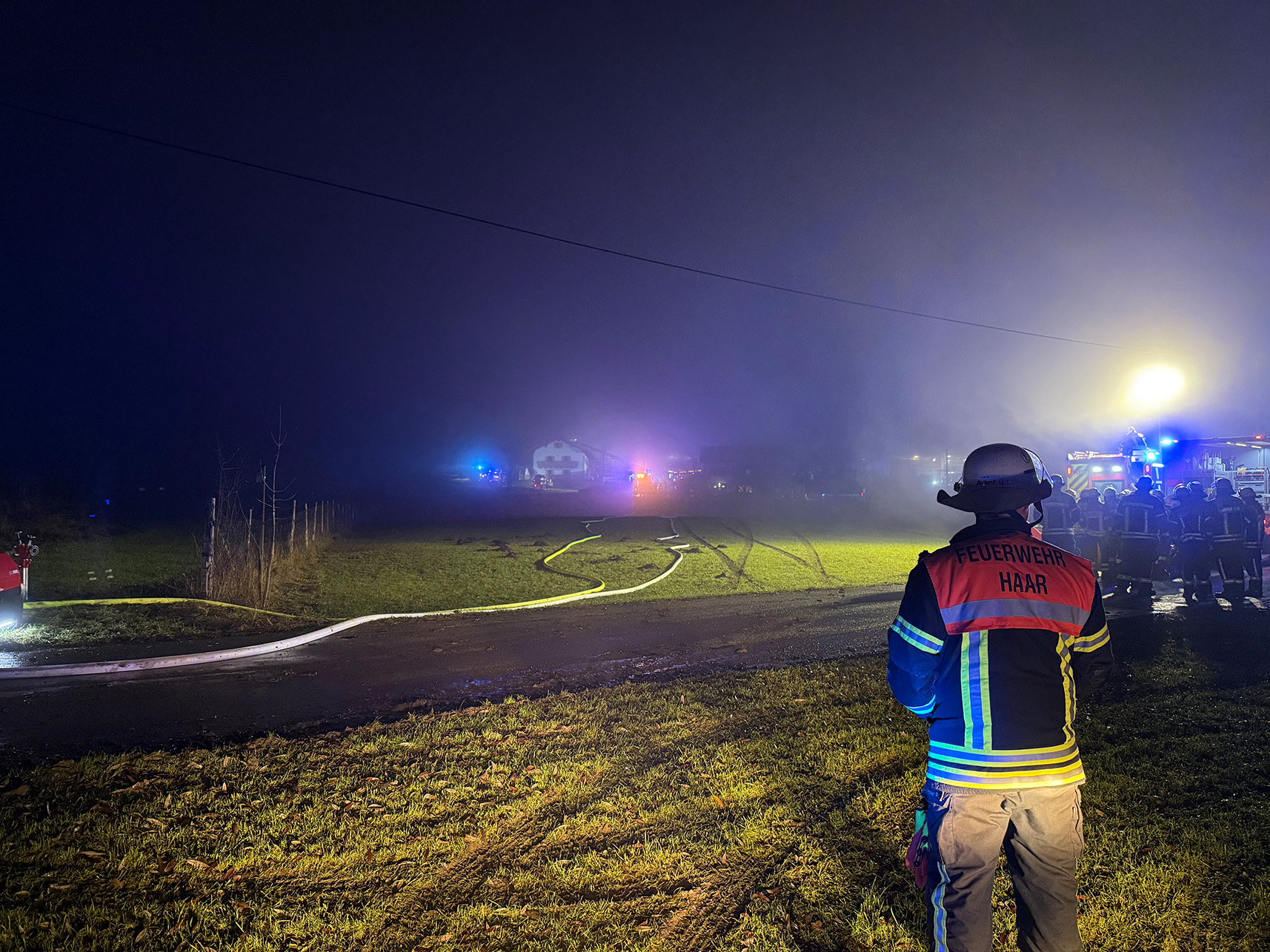 Die Holzhalle eines Aussiedlerhofs war in Brand geraten. Zur Unterstützung bei der Löschwasserversorgung wurde das Tanklöschfahrzeug der Feuerwehr Haar hinzualarmiert. Vor Ort war dann aber kein Eingreifen notwendig, das Fahrzeug blieb zuerst im Bereitstellungsraum und rückte nach Rücksprache wieder ab.