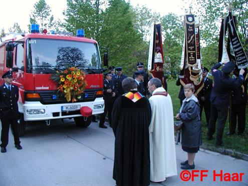 Anlässlich des 100-jährigen Jubiläums des Bezirkskrankenhauses Haar wurde in diesem Jahr die traditionelle Floriansmesse der Freiwilligen Feuerwehr Haar, gemeinsame mit der Werkfeuerwehr erstmals im Bezirkskrankenhaus durchgeführt. Nach einem ökomenischen Gottesdienst in St. Raphael erhielt der neue Rüstwagen der Feuerwehr Haar die kirchliche Weihe. In den letzten vier Wochen hat sich das neue Fahrzeug mit seinen technischen Neuerungen im Einsatzdienst bereits bestens bewährt. Anschließend wurden auch die anderen Fahrzeuge der beiden Wehren von Pfarrer Schamberger und Pfarrerin Meyer gesegnet. Neben den Mitgliedern der Werkfeuerwehr und der Feuerwehr Haar fanden sich auch zahlreiche Freunde und Förderer der beiden Organisationen zu einem Stehempfang im Casino des Bezirkskrankenhauses ein.