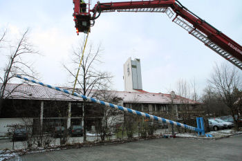 Nach dem Entfernen der Schilder und der Wetterfahne wurde der Baum mit einem Hubsteiger sanft zu Boden gebracht und dort in Handarbeit zersägt.
