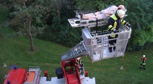Am frühen Abend musste noch ein Kind unter einem PKW gerettet werden. Ein PKW hatte ein Kind angefahren und das Kind eingeklemmt. Mit Hebekissen wurde das Fahrzeug angehoben und das Kind befreit. Zur gleichen Zeit musste eine erkrankte Person aus dem vierten Stock mit der Drehleiter zu Boden gebracht werden.