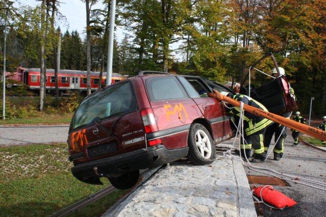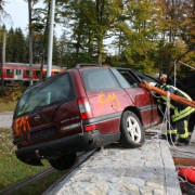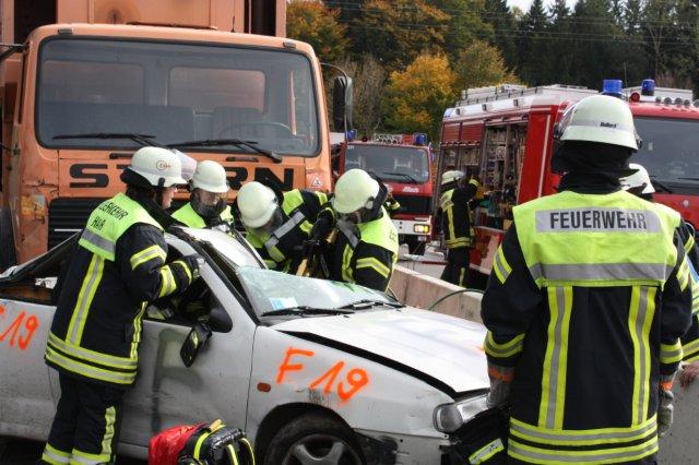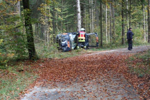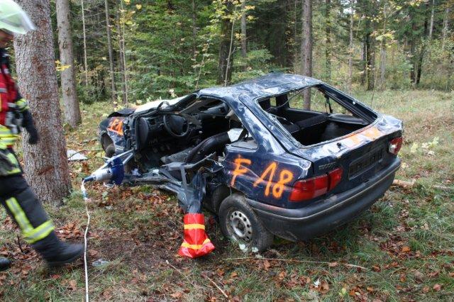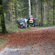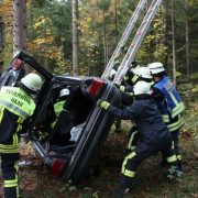 Kaum war diese Lage abgearbeitet, wartete ein weitere Verkehrsunfall im Wald. Ein PKW war von der Fahrbahn abgekommen, an einen Baum geschleudert und kam auf der Fahrerseite direkt an einem Baum zum Liegen. Der Feuerwehrarzt konnte über den Kofferraum zum Verletzten vordringen und ihn betreuen, bis das Auto wieder auf die Räder gestellt werden konnte. Die anschließende Befreiung des Fahrers war reine Formsache. Mit zwei Scheren und Rettungsspreizern konnte die notwendige Öffnung geschaffen werden und die Person befreit werden.