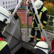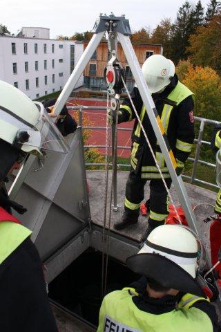Beim letzten Einsatz dieses Übungstages war die Meldung "Person in Silo verschüttet". Die Erkundung zeigte, dass im unteren Bereich eines Silos mit Schüttgut eine Person nahezu komplett verschüttet wurde. Ein Retter der Feuerwehr stieg mit einer Leiter zur Person hinunter und sicherte sie. Über eine Luke im Dach des Silos konnten die Personen über eine Rettungswindel mit dem Rollgliss und einem Stativ gerettet werden. Mit dem Kran des LKW konnten die Personen dann vom Dach des Silos mit einer Schleifkorbtrage zu Boden gebracht werden.