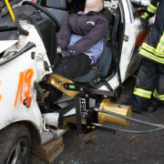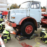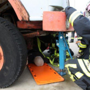 Gleich der erste Einsatz mit einer eingeklemmten Person unter dem Vorderreifen eines LKW forderte den Zugführer und seine beiden Gruppenführer. Galt es doch die Person möglichst schnell und schonend aus ihrer misslichen Lage zu befreien. Mit hydraulischen und pneumatischen Rettungsgeräten wurde die beste Möglichkeit ermittelt, so dass die Person schließlich gerettet werden konnte. Der anwesende Feuerwehrarzt konnte zusätzlich die bestmögliche Betreuung der Übungspuppe während der Rettung sicherstellen.