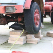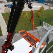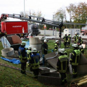 "Einsatz für die Feuerwehr Haar, Bauunfall in der Industriestraße, Person unter Betonplatten eingeklemmt". Die Erkundung des Zugführers ergab, dass eine Person unter mehreren schweren Betonplatten eingeklemmt war. Vermutlich waren die Platten umgekippt und rissen einen Arbeiter dabei um, der nahezu komplett unter den Platten eingeklemmt wurde. Mit hydraulischen Winden und Hebekissen wurden die Platten stabilisiert. Zur weiteren Sicherung kam der Kran des LKW zum Einsatz. Aufgrund der Entfernung zum Standplatz konnte der Kran leider nicht die notwendige Kraft aufbringen, um die Platten anzuheben. Mit den Winden gelang es schließlich, die Puppe unter den Platten zu befreien.