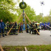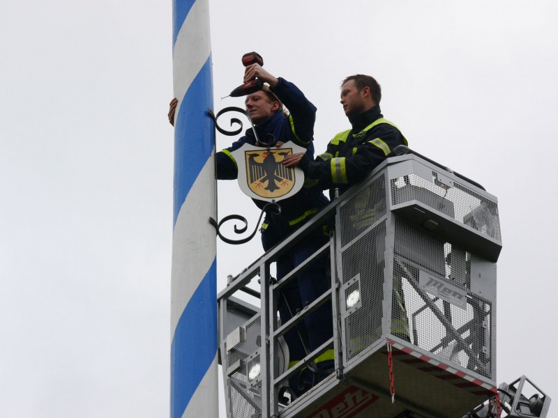 Alle Hilfsorganisationen des Zentrums stellten zusammen nach althergebrachter Tradition "ihren" Maibaum per Hand auf. Dabei zeigte sich wieder mal, dass die Hilfsorganisationen perfekt Hand in Hand arbeiten und sich gegenseitig unterstützen können. Es dauerte keine Stunde, bis der neue Baum aufrecht stand und alle Schilder und die Spitze befestigt waren.