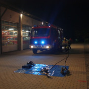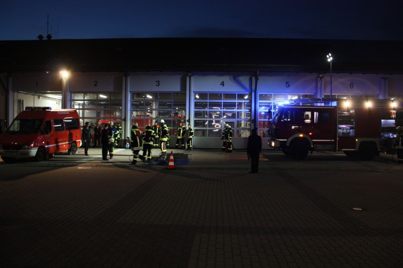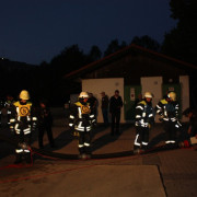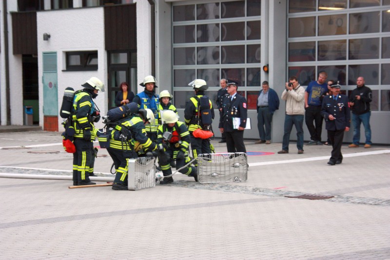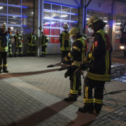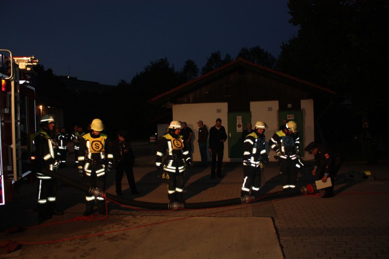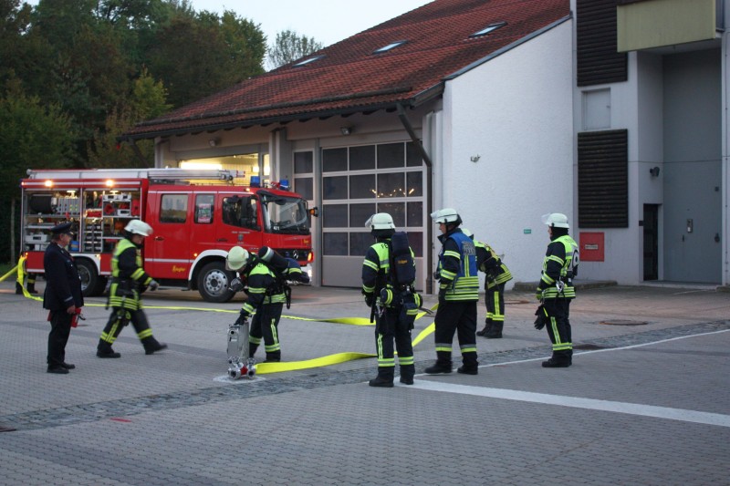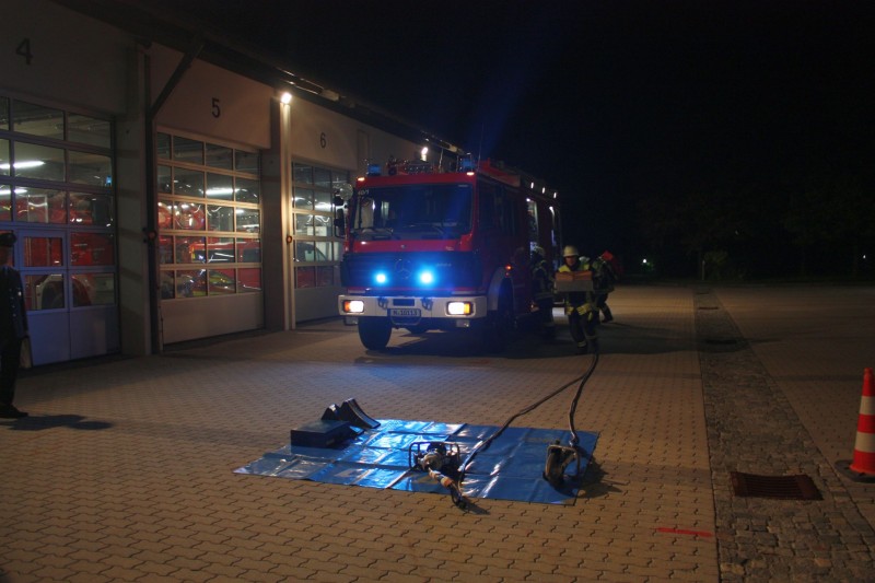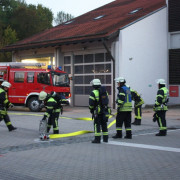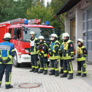 Den Anfang machte am 1. September eine Gruppe mit der Prüfung zum Löscheinsatz. Hier wird als Lage ein Zimmerbrand im Erdgeschoß angenommen, der in der vorgegebenen Zeit von nur 300 Sekunden abgearbeitet werden muss. Dafür muss die Einsatzstelle abgesichert werden, die Wasserversorgung aus dem Hydranten Netz aufgebaut und zwei Trupps mit schwerem Atemschutz ausgerüstet werden. Wenn der Aufbau steht, müssen zwei Trupps mit Strahlrohren die obligatorischen Eimer umspritzen. Im zweiten Teil der Prüfung muss in einer bestimmten Zeit gezeigt werden, dass die Einsatzkräfte das Saugschlauchkuppeln beherrschen, das immer dann zum Einsatz kommt, wenn mal kein Hydrant in der Nähe ist.