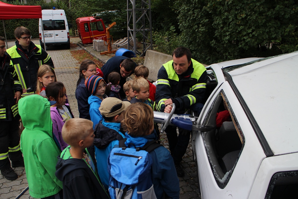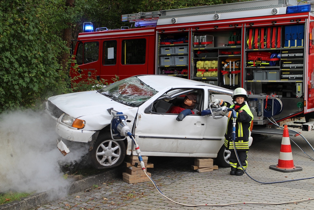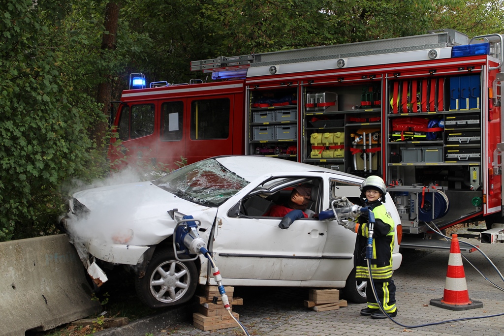Die Buben und Mädchen im Alter zwischen 6 und 12 Jahren zeigten schon bei der ersten Führung durch das Haus reges Interesse und durchlöcherten die Kameraden der Freiwilligen Feuerwehr Haar mit Fragen. Schon folgte das nächste Highlight: Im Anschluss an die Hausführung entdeckten die Kinder eine simulierte Unfallstelle im Hof der Feuerwehr. Mit großen Augen konnten sie direkt die Rettungsgeräte ausprobieren, während die Unfallstelle mit viel künstlichem Rauch die perfekte Umgebung für ein kurzes Fotoshooting bot.