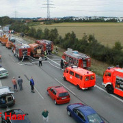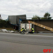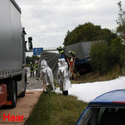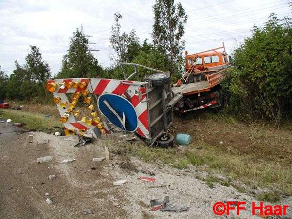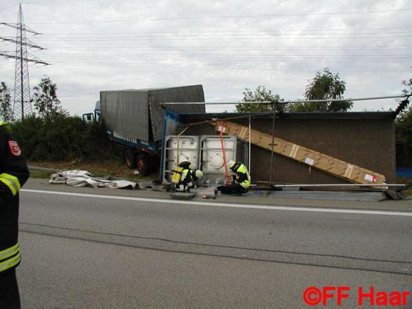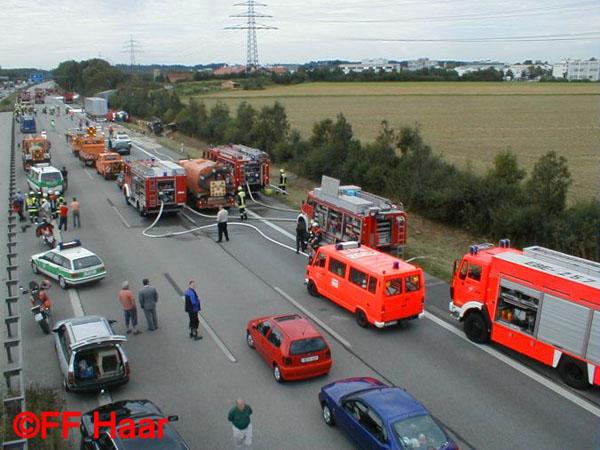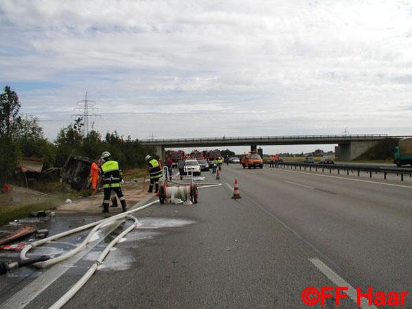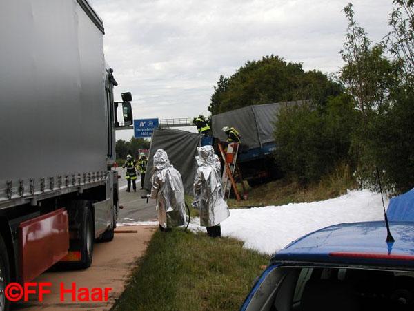 Nach Angaben der Polizei war der LKW von der rechten Fahrspur abgekommen und fuhr auf einen auf der Standspur stehenden Verkehrssicherungsanhänger sowie auf einen dahinter stehenden PKW auf. Der LKW samt Anhänger geriet in den Grünstreifen und der Anhänger stürzte um, geringe Mengen Aceton traten über eine Befüllöffnung aus. Glücklicherweise wurde niemand verletzt. Die alarmierten Kräfte der Feuerwehr aus Haar, Vaterstetten, Putzbrunn und Ottobrunn, sowie der ABC-Zug nahmen das auslaufende Aceton mit Mulden auf und führten Messungen durch. Nachdem der Austritt gestoppt war wurden die Behälter mit Aceton aufgerichtet und zu einer Spezialfirma gebracht. Um eine Brandgefahr auszuschließen wurden die Entwässerungsgräben seitlich der Autobahn eingeschäumt und die Autobahn Richtung Salzburg während der gesamten Arbeiten komplett gesperrt.