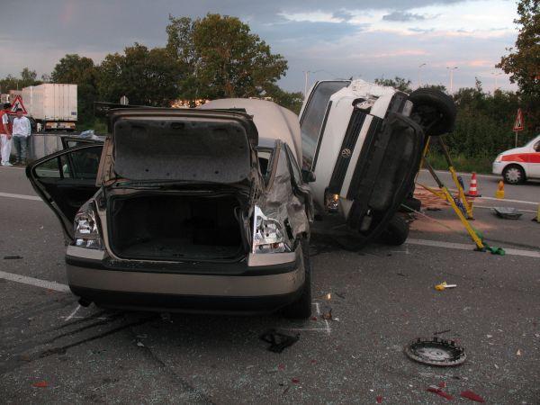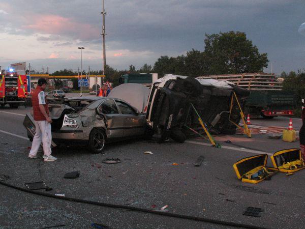 Beim Eintreffen der ersten Kräfte am Unfallort an der Rastanlage Vaterstetten West, bot sich den Helfern ein Bild der Verwüstung. Mehrere PKW, ein Kleinbus und ein LKW lagen auf der Fahrbahn, der Kleinbus und der LKW waren umgestürzt.