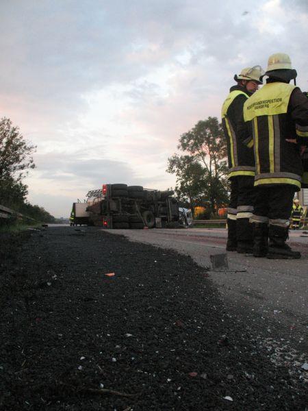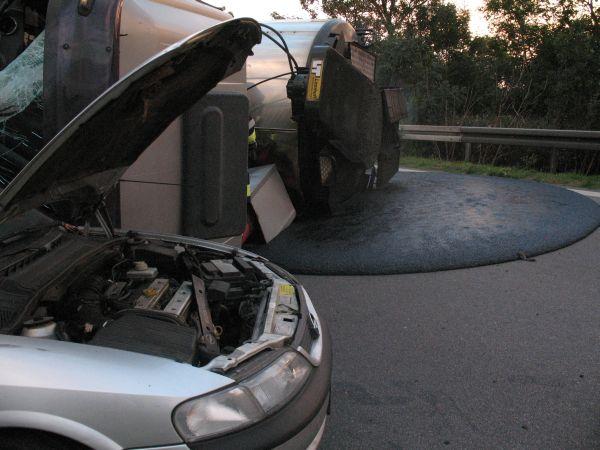 Bei der ersten Erkundung stellte sich heraus, dass glücklicherweise keine Personen mehr in den Fahrzeugen waren, es gab aber einige Leichtverletzte, die vom Rettungsdienst versorgt wurden. Aus dem umgestürzten LKW trat heißes Bitumen aus, das teilweise die Fahrbahn bedeckte.