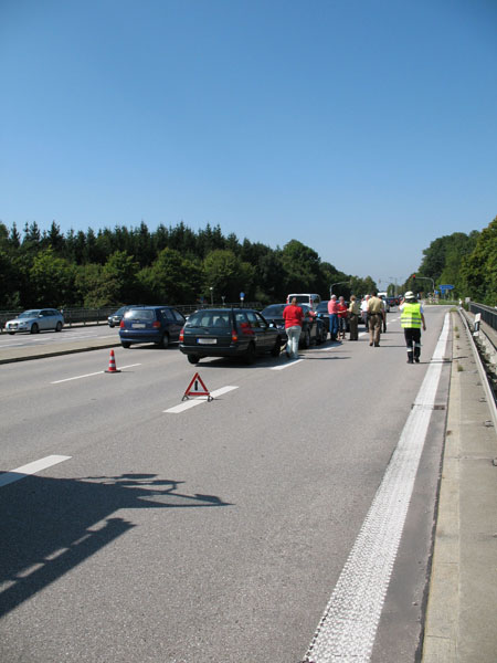 Die Feuerwehr Haar wurde zum Fahrbahnreinigen nach einem Auffahrunfall mit drei beteiligten PKW auf der B304 gerufen. Aus dem letzten, aufgefahrenen Fahrzeug ist Kühlwasser ausgelaufen, der Fahrer musste medizinisch versorgt werden. Während der Arbeiten mussten zwei der drei Fahrspuren gesperrt werden.