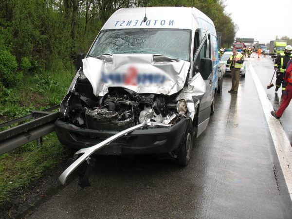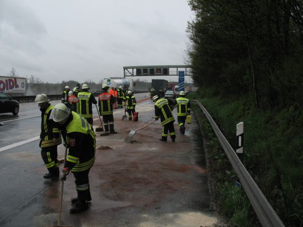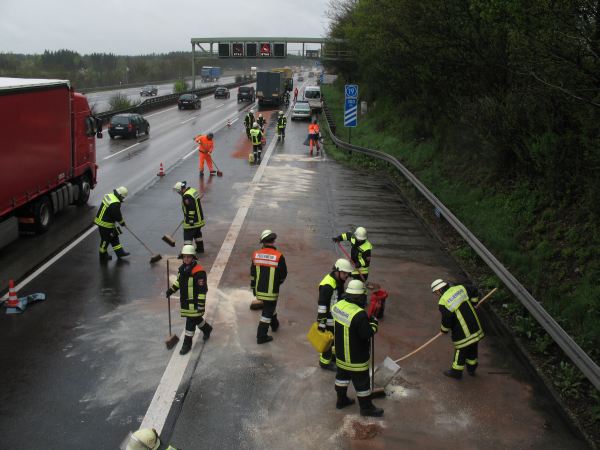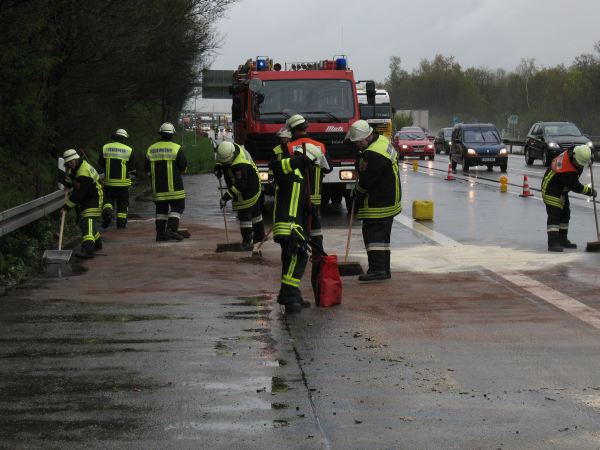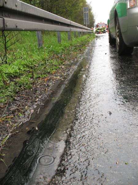 Nach einem Auffahrunfall eines Kleintransporters auf einen LKW liefen aus dem Kleintransporter Betriebsstoffe aus. Die Feuerwehr nahm die ausgelaufenen Stoffe mit Ölbinder auf und reinigte anschließend die Fahrbahn mit dem Schnellangriff auf einer Länge von ca. 120 Metern.