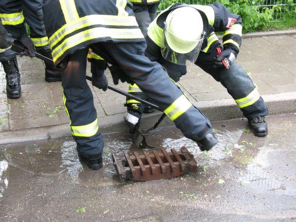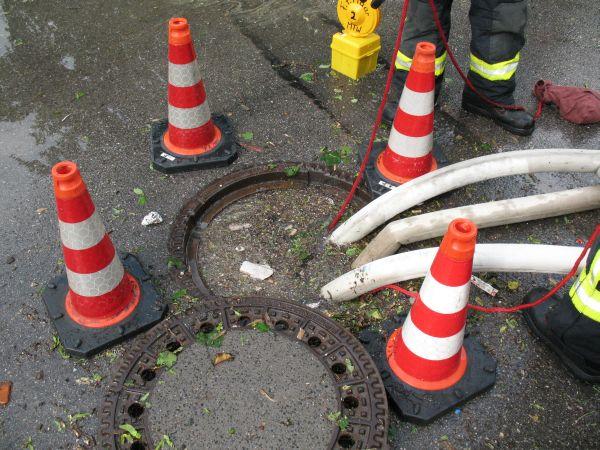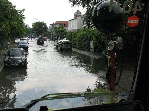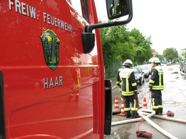 Die Kreuzung Waldluststraße und Franz-Schubert Straße wurde durch den Starkregen unter Wasser gesetzt. Die FF Haar öffnete mehrere Gullys, leerte die Auffangkörbe und pumpte einen vollgelaufenen Sickerschacht mittels Aquamat aus.