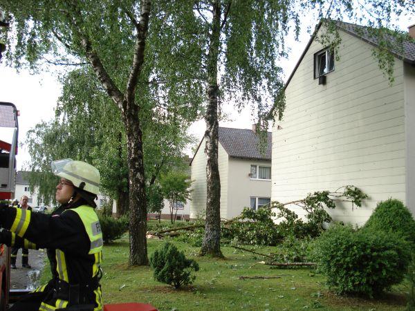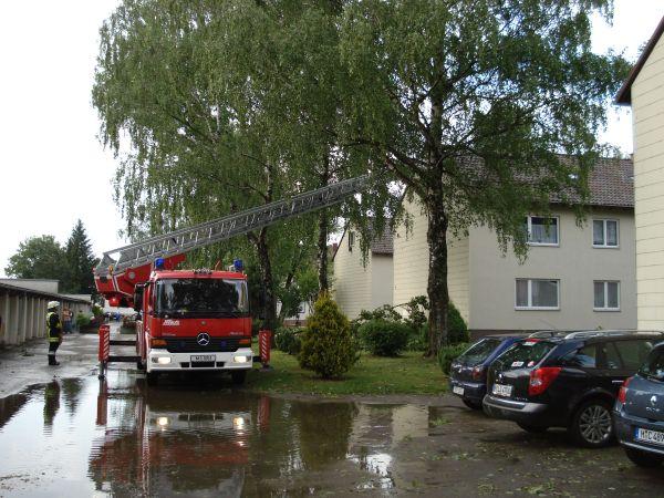 Die Feuerwehr Haar unterstützte die FF Putzbrunn mit der Drehleiter und Mannschaft. In der Josef-Knappich Straße waren durch Sturmböhen mehrere Bäume und ein Dach in Mitleidenschaft gezogen worden. Die FF Haar entfernte lose Astteile auf einem Hausdach und dichtete dieses am First notdürftig mit einer Plane ab, da mehrere Dachreiter durch den Sturm beschädigt wurden.