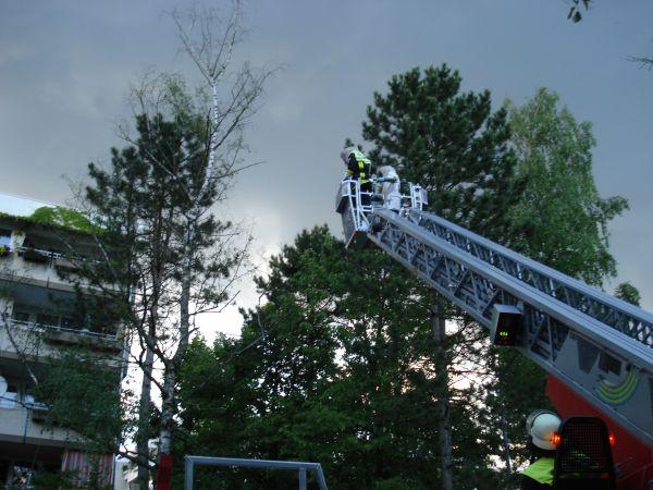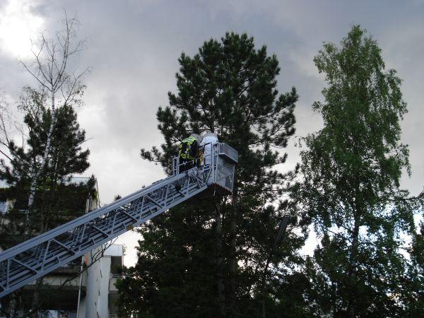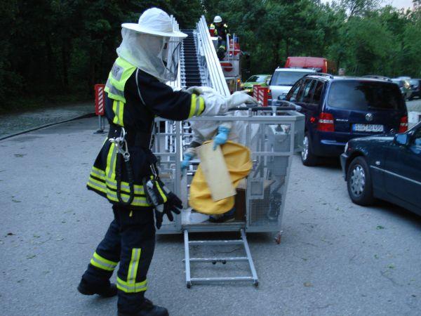 In der Ferdinand-Kobell-Straße benötigte ein Imker die Hilfe der Feuerwehr. Mittels Drehleiter konnte der Imker einen in einem Baum sitzenden Bienenschwarm einfangen.