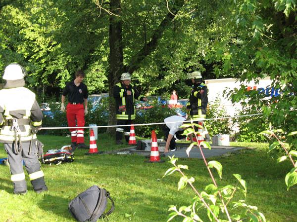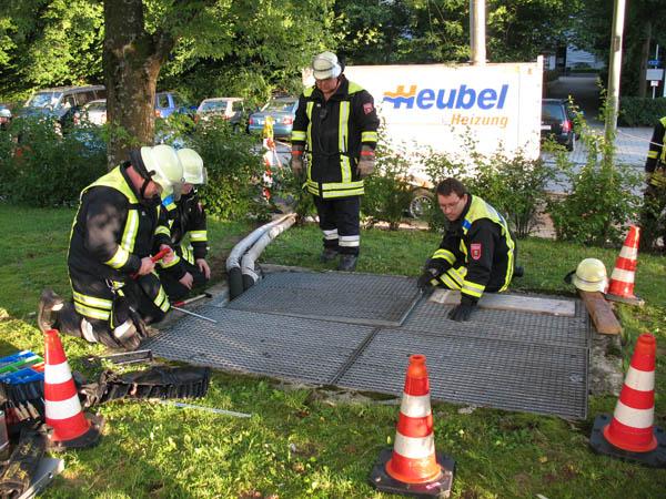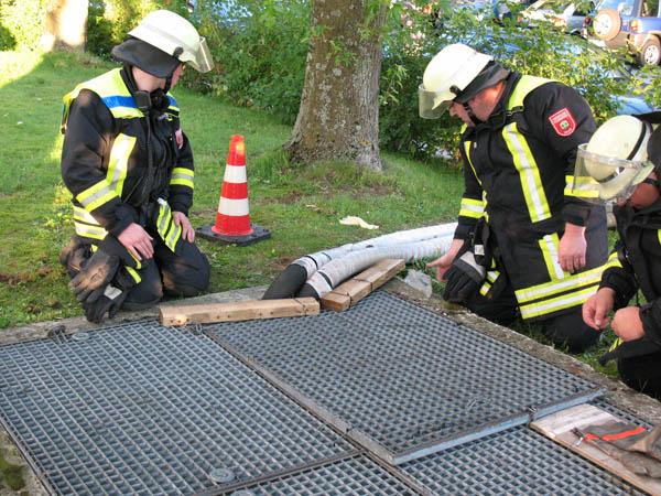 Die Feuerwehr sicherte das Abdeckgitter gegen ein erneutes Verrutschen mit Draht und Kabelbindern und verschloss die verbleibenden Lücken mit Holz.