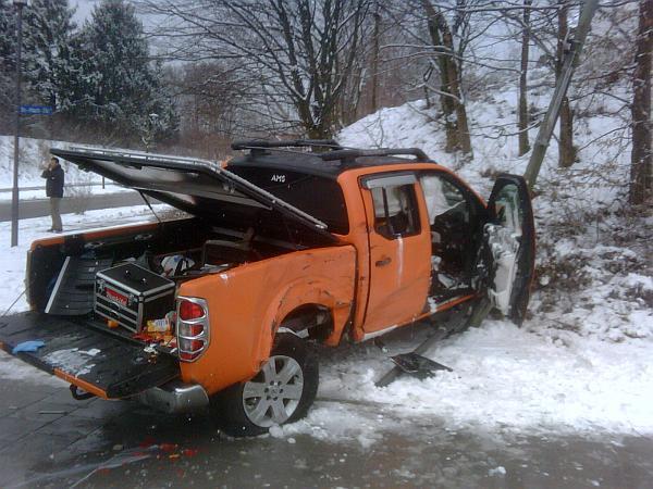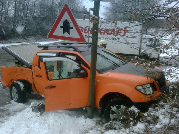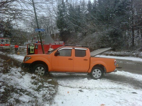 Ein Kleinlastwagen war mit einem Pickup zusammengestoßen und hat diesen auf einen Laternenmasten geschoben. Dabei wurde der Fahrer des Pickups mittelschwer und der Fahrer des Lastwagens leicht verletzt. Bis zum Eintreffen des Rettungsdienstes versorgte die Feuerwehr die beiden Fahrer und sicherte die Unfallstelle ab. Zusätzlich wurden die Stromwerke benachrichtigt, um den Laternenmasten zu sichern.