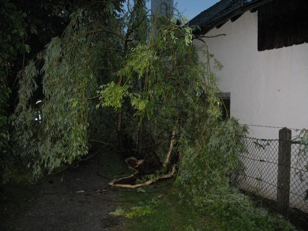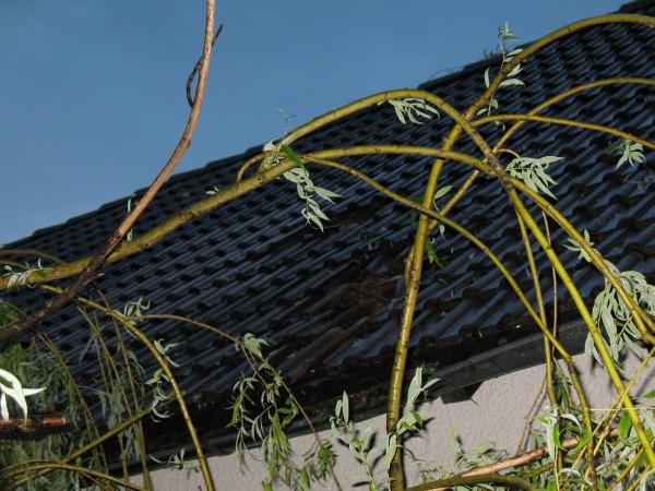 Die Feuerwehr entfernte den Baum mit der Kettensäge und dichtete anschließend das entstandene Loch in der Dachhaut mit vorhandenen Dachziegeln wieder ab.