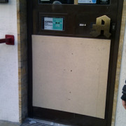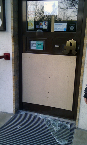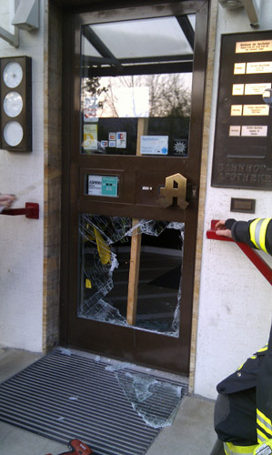 Die Glasscheibe der Eingangstür der Bahnhofsapotheke wurde mutwillig eingetreten.