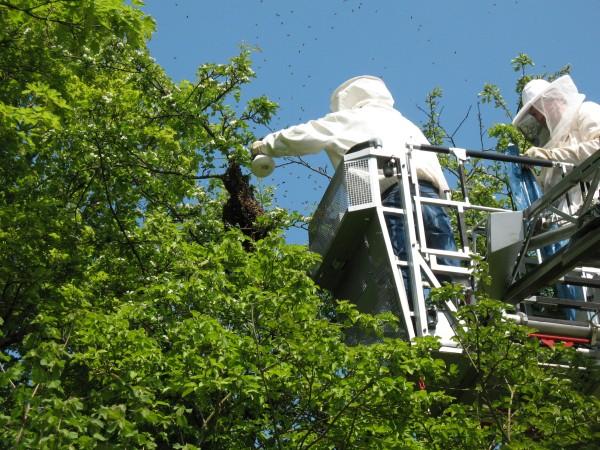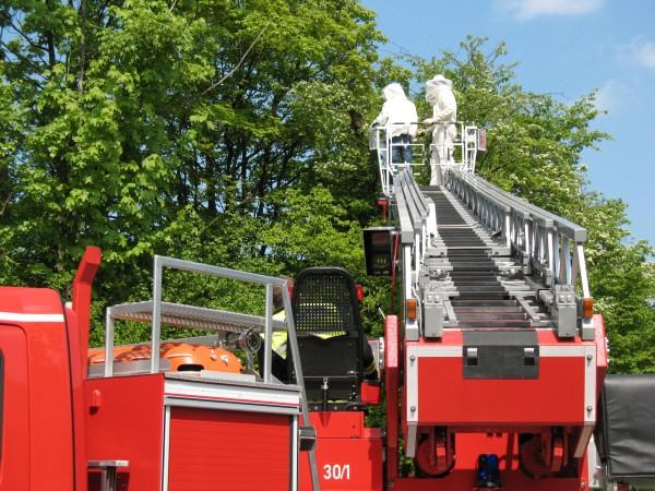 Mit der Drehleiter konnte eine Lehrkraft zusammen mit einem Schüler das Bienenvolk wieder einfangen. Dazu musste der Ast abgesägt werden, an dem sich das Volk gesammelt hatte.