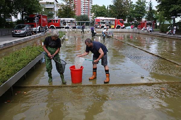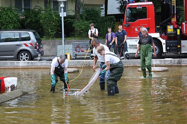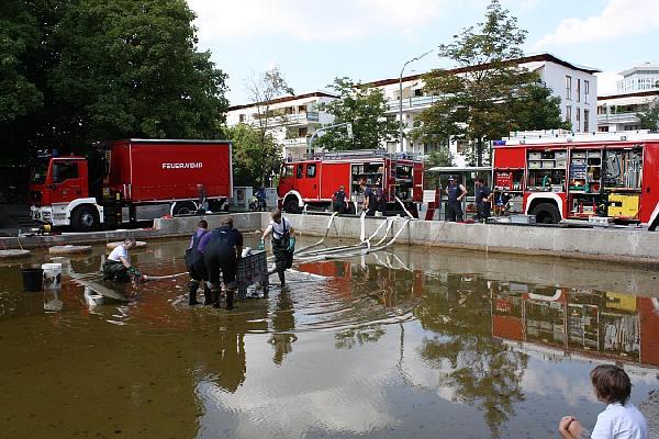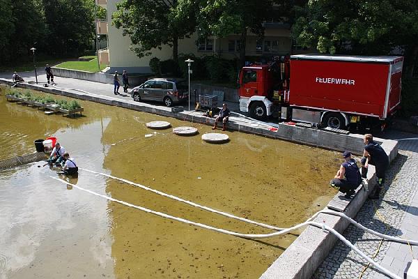 Die Feuerwehr Haar unterstütze die Gemeinde beim Abpumpen des kleinen Sees im Jagdfeldring. Dieser sollte zu Reinigungsarbeiten abgelassen werden. Dabei stellte sich heraus, dass eine Menge Fische inzischen im See leben, die abgefischt werden mussten.