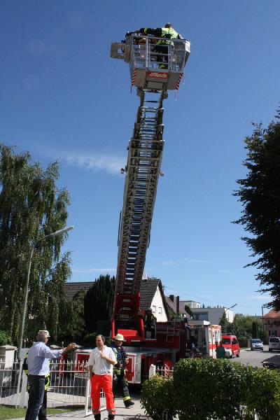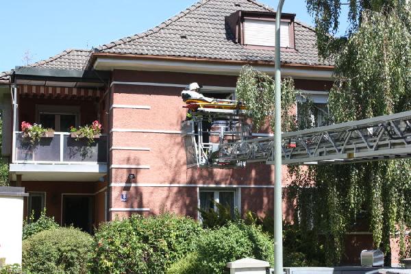 Dort versorgten Notarzt und Rettungsdienst eine ältere Dame, die nur liegend aus dem ersten Obergeschoss transportiert werden konnte. Mit der Krankentragenhalterung am Drehleiterkorb konnte die Dame sicher zu Boden gebracht werden und an den Rettungsdienst übergeben werden.