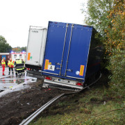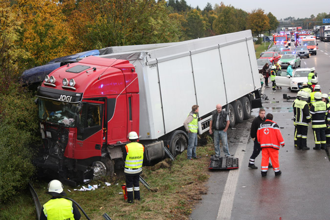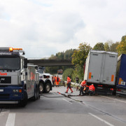 Direkt im Anschlussstellenbereich Haar der A99 in Fahrtrichtung Salzburg hatte sich ein Verkehrsunfall mit zwei beteiligten LKW und zwei PKW ereignet. Vermutlich durch unachtsames Auffahren auf die Autobahn zwang die Fahrerin eines PKW einen voll beladenen Sattelzug zu einer Vollbremsung mit einem Ausweichmanöver, bei dem ein weiterer PKW getroffen wurde und ins Schleudern geriet. Bis der LKW zum Stehen kommen konnte, schnitt er einen weiteren LKW seitlich und beide Sattelzüge kamen nach rechts von der Fahrbahn ab, rissen die Leitplanke mit und landeten im rechten Straßengraben. Glücklicherweise wurde bei diesem Unfall nur eine Person verletzt und konnte mit einem Rettungswagen zur weiteren Behandlung abtransportiert werden.