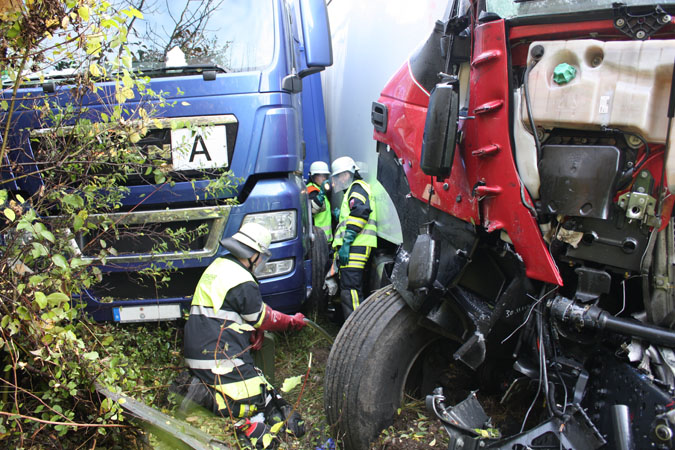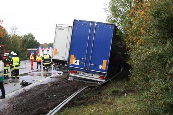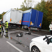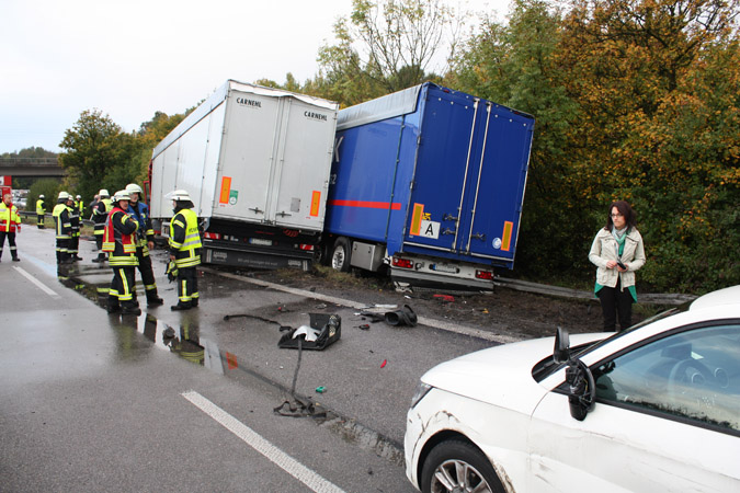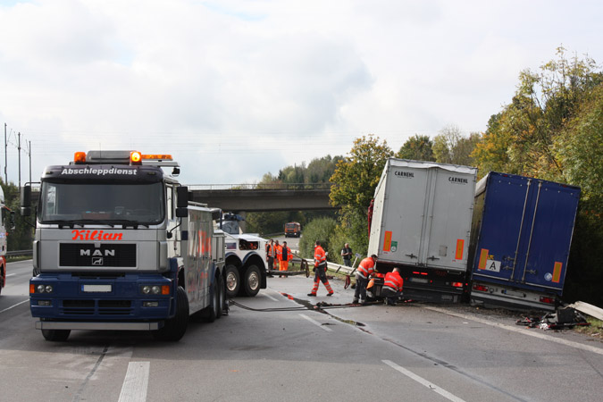 Sicherheitshalber wurden bei dieser Meldung die Feuerwehren aus Vaterstetten und Haar zusammen mit mehreren Rettungswagen und dem Rettungshubschrauber Christoph 1 alarmiert. Die ersteintreffenden Einsatzkräfte der Feuerwehr Haar sicherten die Einsatzstelle ab und erkundeten die Lage. Es stellte sich heraus, dass keine Personen in den Fahrzeugen eingeklemmt waren und schnellstmöglich die Betriebsstoffe der LKW abgepumpt werden mussten. Bei dem Unfall riss der Tank eines LKW auf und Diesel lief aus.
