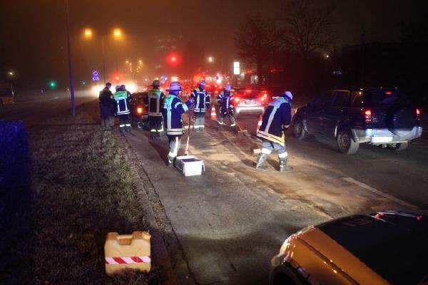 Dort liefen Betriebsstoffe aus einem beschädigten PKW aus. Diese wurden durch Ölbindemittel aufgenommen und entsorgt. Die Feuerwehr stellte entsprechende Ölspur-Warnschilder auf, um auf die Gefahrenstelle hinzuweisen.