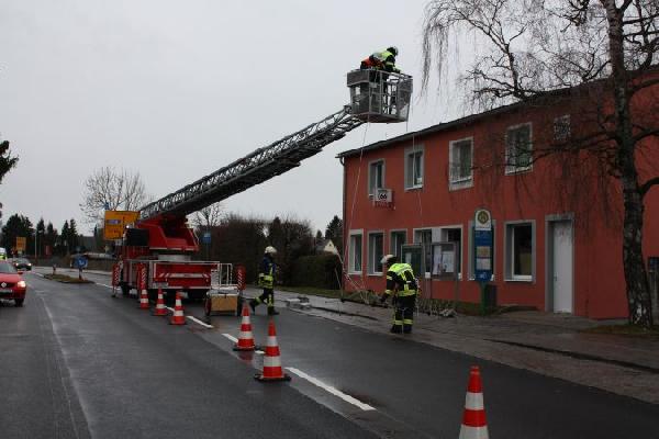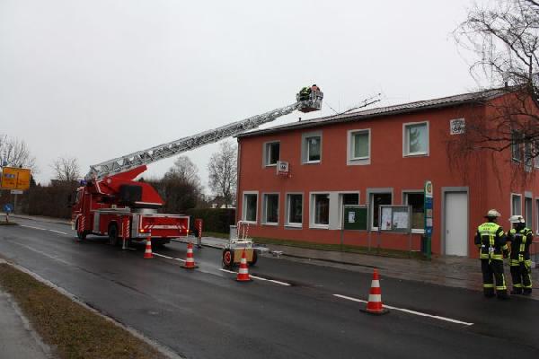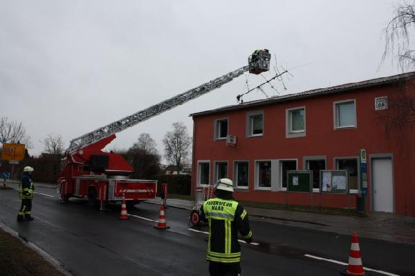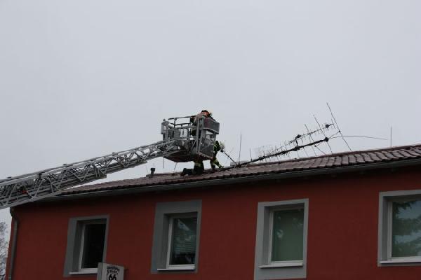 Die Feuerwehr rückte mit der Drehleiter an und entfernte die Antenne, bevor sie unkontrolliert zu Boden stürzen konnte. Weitere kleinere Schäden am Dach werden von der Gemeinde repariert, die Feuerwehr konnte wieder abrücken.