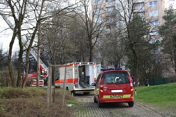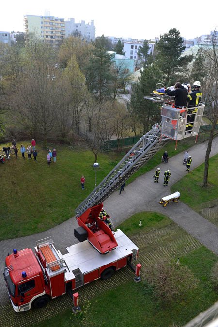 Die Drehleiter der Feuerwehr Haar wurde in den Jagdfeldring alarmiert, um eine verletzte Person zu Boden zu bringen.