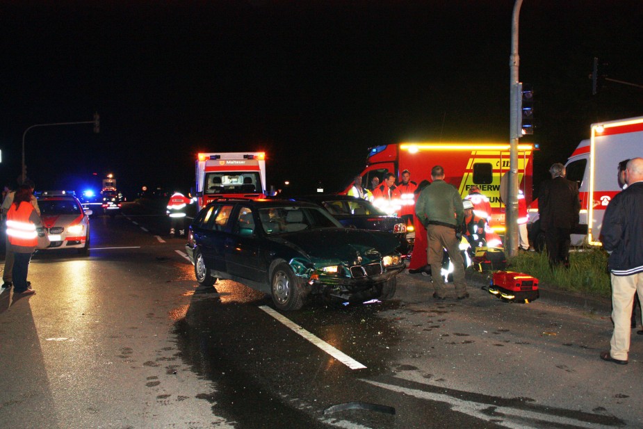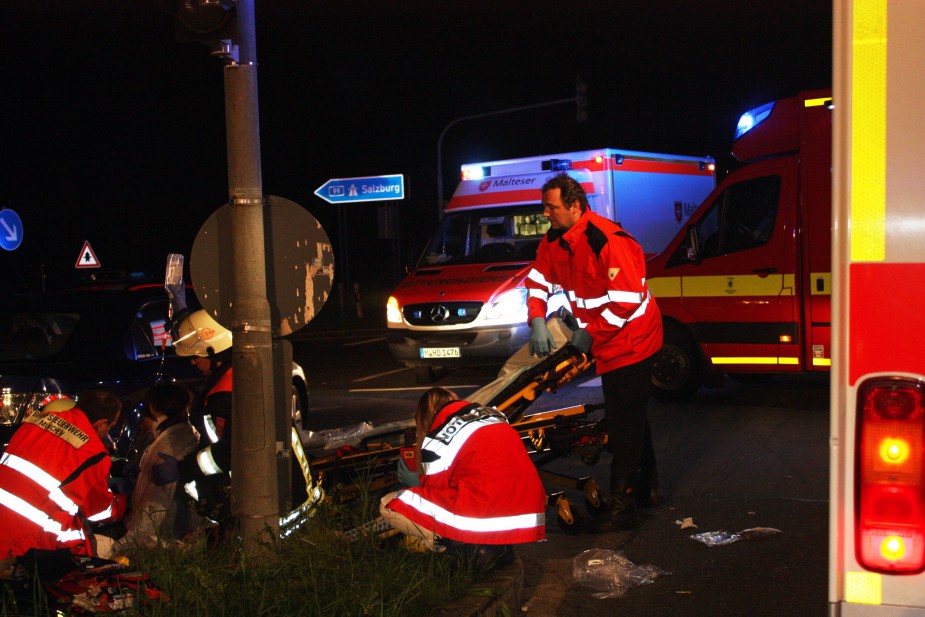 Vor Ort stellte sich die Einsatzadresse als falsch heraus, der Unfall hatte sich in der Kreuzung der B304 mit der A99 (Einfahrt Richtung Salzburg) ereignet, etwa 2km entfernt. Zwei PKW waren miteinander kollidiert, dabei wurden alle zehn Insassen verletzt und mussten vor Ort behandelt werden. Zwei Insassen wurden zur Sicherheit mit dem Rettungswagen in eine Münchner Klinik zur weiteren Behandlung gebracht.