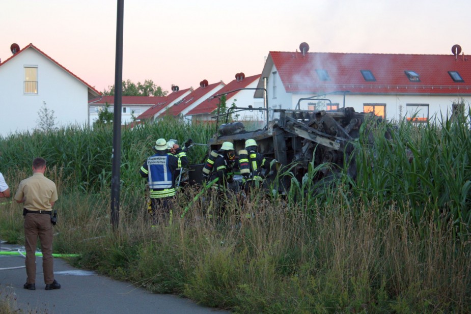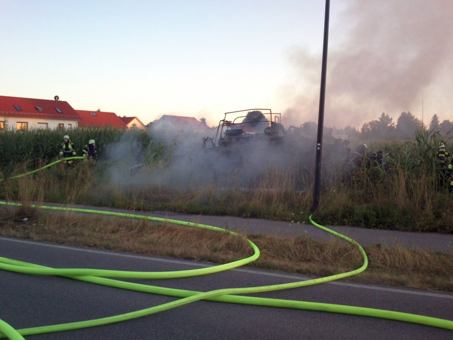Parallel dazu unterstützte das Tanklöschfahrzeug TLF4000 bei der Kontrolle des Stoppelfelds, von dem der Traktor gekommen war; dort war bereits das Feuer aus und kein weiteres Eingreifen erforderlich.
