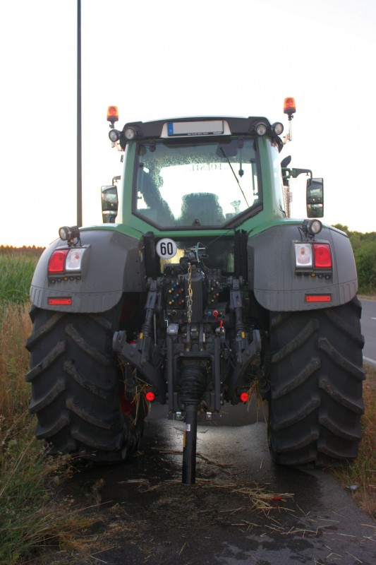 Ein Landwirt bemerkte, dass die angehängte Strohballenpresse an seinem Traktor in Brand geraten war. So schnell wie möglich versuchte er das brennende Gerät vom abgeernteten, sehr trockenen Stoppelfeld zu bringen, damit das Feld nicht in Brand geraten konnte. Er kuppelte die Maschine neben der Straße ab und brachte den Traktor in Sicherheit.