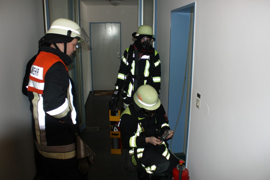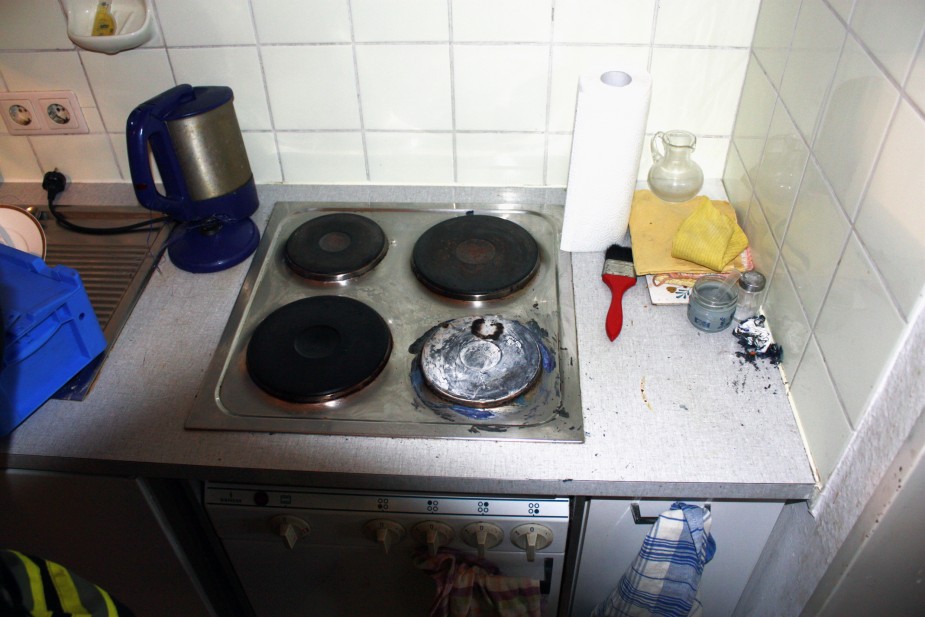 Bei der Ankunft der Feuerwehr war leichter Brandgeruch im Treppenhaus wahrnehmbar, der aus der Wohnung einer älteren, leicht verwirrten Dame im ersten Obergeschoss drang. Mit der Steckleiter über den Balkon konnten die Einsatzkräfte die Wohnung betreten und fanden einen elektrischen Wasserkocher auf der eingeschalteten Herdplatte vor. Zur Sicherheit war ein Trupp unter schwerem Atemschutz mit Kleinlöschgerät vor Ort. Nach Ausschalten des Herds konnte nach der Belüftung Entwarnung gegeben werden.