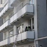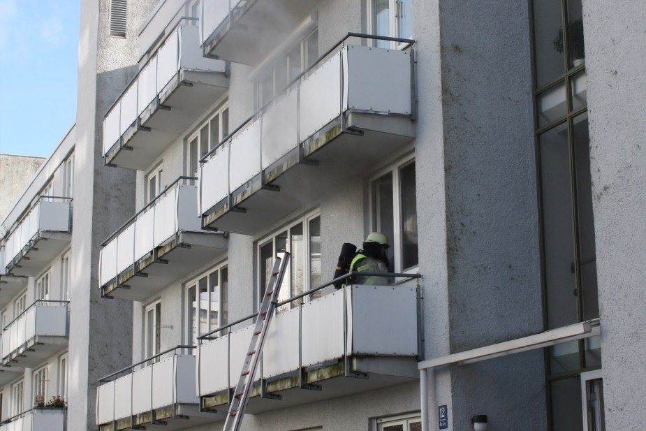 Bei Ankunft der Feuerwehr war eine leichte Verrauchung vor der Eingangstür der Brandwohnung wahrnehmbar. Ein Trupp unter Schwerem Atemschutz ging mit Kleinlöschgerät in den Innenangriff über die Eingangstür vor. Ein weiterer Trupp war in Anleiterbereitschaft über den Balkon. Um den Rauch in der Wohnung zu halten kam ein mobiler Rauchabschluss zum Einsatz.