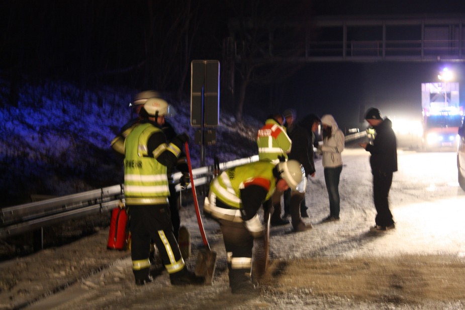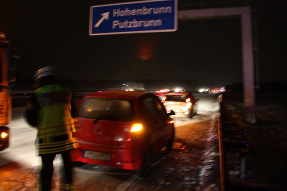 Aufgrund der schlechten Witterung mit Schneeglätte war es auf der A99 kurz vor der Anschlussstelle Hohenbrunn zu zwei Auffahrunfällen mit insgesamt fünf beteiligten PKW im Abstand von 300 Metern gekommen. Bei beiden Unfällen wurde niemand verletzt, ein zufällig vorbeikommender Rettungswagen alarmierte die Feuerwehr.