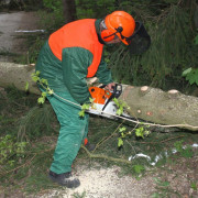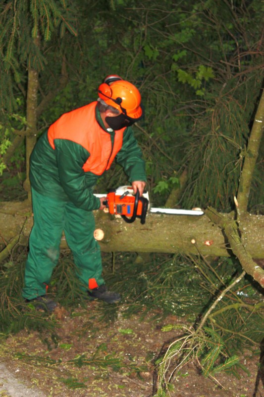 Unbekannte hatten in der Nacht einen zweistämmigen Baum auf einer Höhe von etwa 1,8m umgesägt. Die beiden Stämme sind dabei in die Stromleitung gefallen und hatten diese abgerissen. EON wurde hinzugezogen, um die Leitung zu sichern und zu reparieren. Die Feuerwehr zersägte die Bäume und legte sie am Seitenstreifen ab.