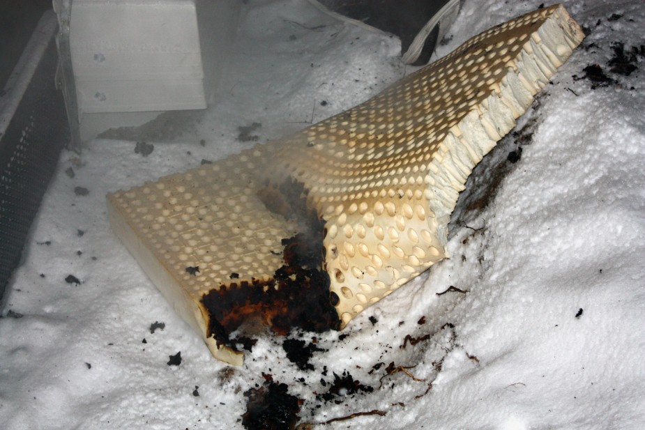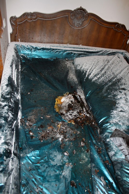 Noch während des vorangegangenen Einsatzes meldete ein Anwohner der Zunftstraße telefonisch, dass bei ihm eine Matratze in Brand geraten war. Er hatte bereits Löschversuche mit einem Pulverlöscher unternommen, den Schmorbrand aber nicht stoppen können.