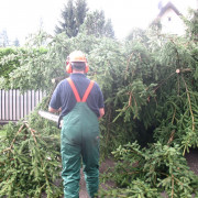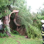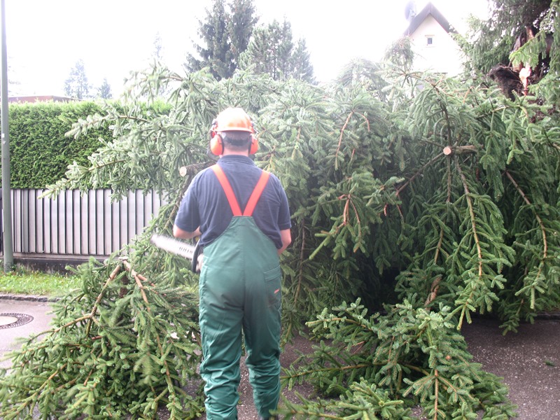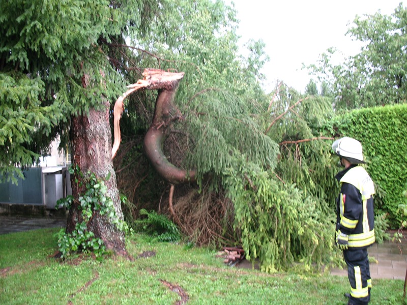 Bei einem Unwetter war auf einem Grundstück in der Sofienstraße ein Baum umgestürzt. Teile ragten auf die Fahrbahn. Mit einer Kettensäge schnitten die Einsatzkräfte die Straße frei und reinigten anschließend die Fahrbahn.