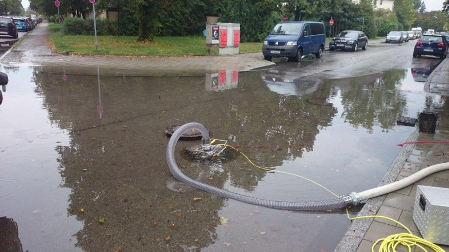 Dort stand die Fahrbahn auf einer Fläche von etwa 200m² 20-25cm unter Wasser. Nach Reinigen der Abläufe konnte das Wasser wieder abfließen, zusätzlich kam eine Mini-Chiemsee-Pumpe zum Einsatz.