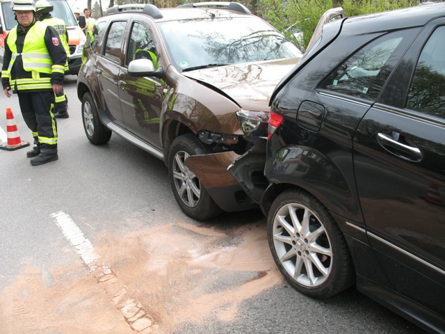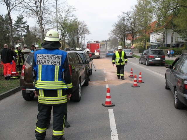 Die Feuerwehr Haar wurde zum Fahrbahnreinigen nach einem Verkehrsunfall auf die B304 alarmiert. Zwei Fahrzeuge waren in einen Auffahrunfall verwickelt. Die Unfallstelle wurde durch die Feuerwehr abgesichert und auslaufende Kühlflüssigkeit mit Bindemittel aufgenommen.